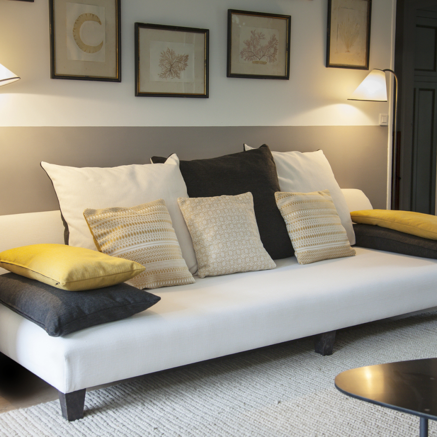 Camaieu de coussins avec une banquette sur mesure. Banquette avec raccord motifs sur plate bande +